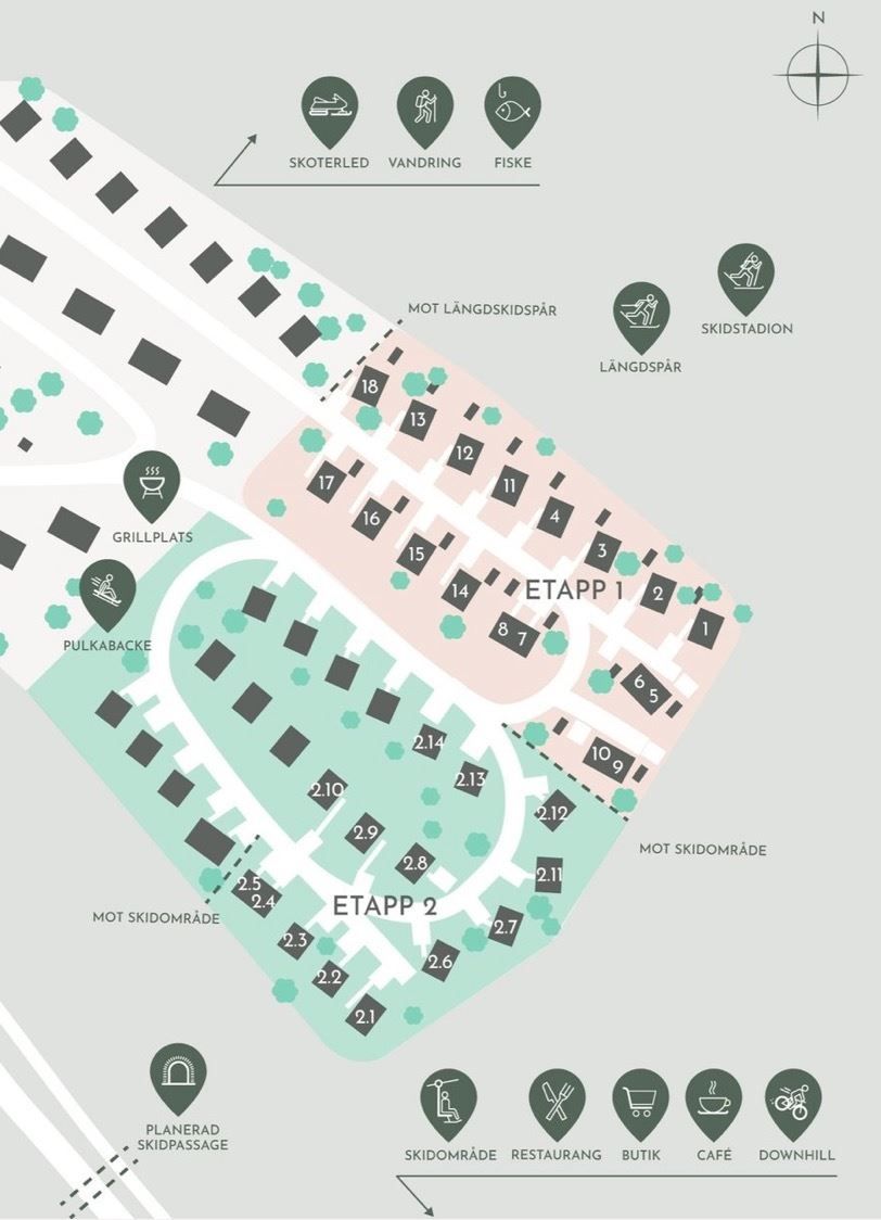 En första etapp är färdigbyggd och nu är etapp 2 med 14 ytterligare fjällbostäder i full gång att byggas. Totalt planeras det för ca 80 hus i den nya fjällbyn.