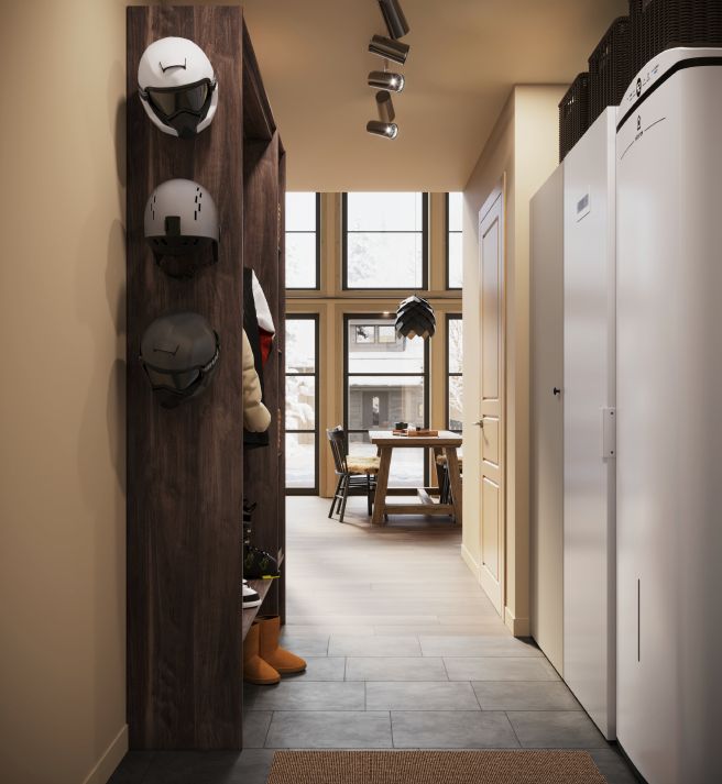 Parhuset erbjuder en unik kombination av modern arkitektur och fjällkänsla, vilket gör det till en fantastisk bostad för fjällälskare. Med sina stora fönster och genomtänkta materialval, som den patinagrå borstade panelen och slitstarka vinylgolvet i mörkbrun eklook, ger det en varm och ombonad atmosfär. Här kan man verkligen koppla av och njuta av lugnet. Den öppna planlösningen mellan allrum och kök, tillsammans med den imponerande takhöjden som sträcker sig ända upp till nock, skapar en rymlig och inbjudande miljö.