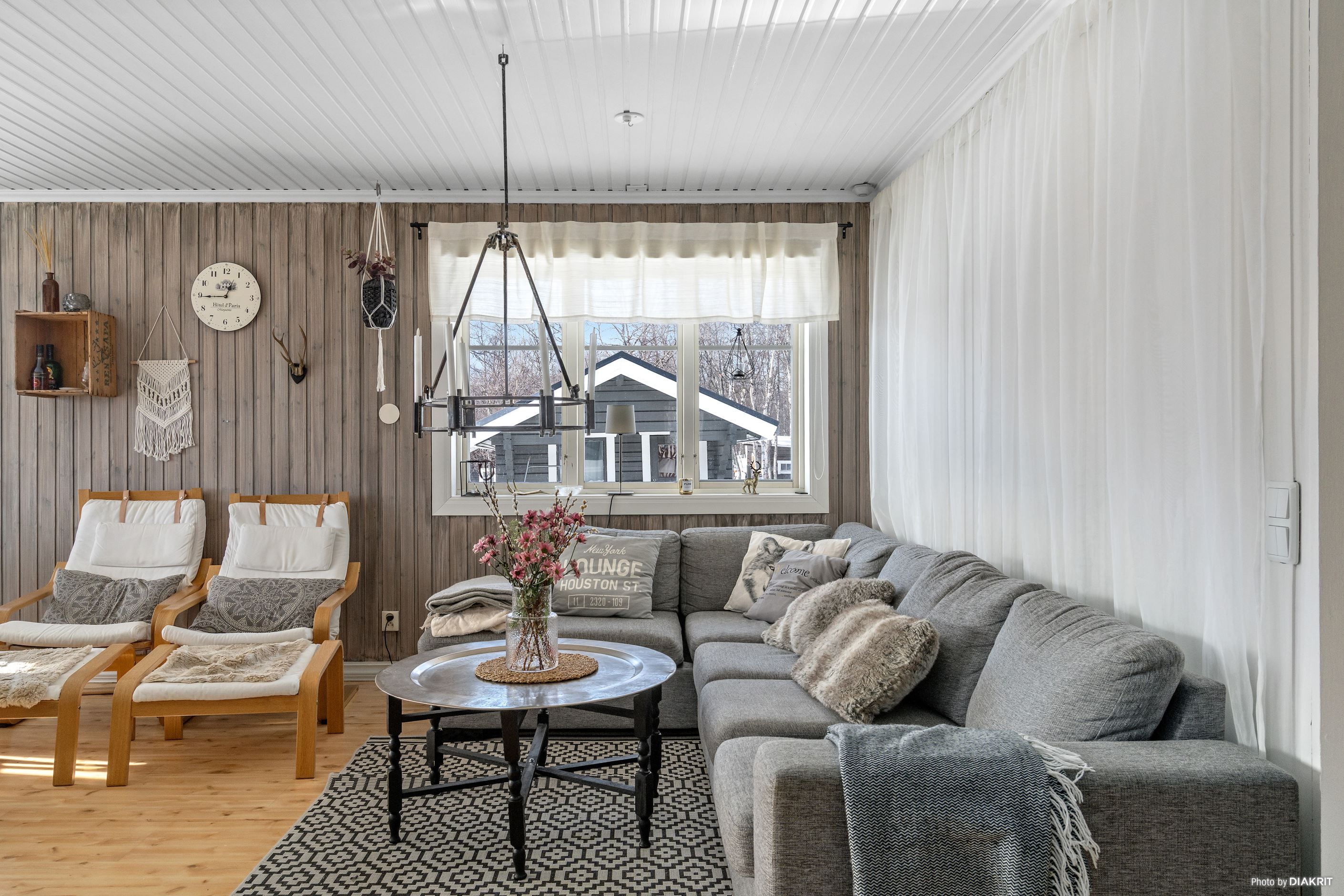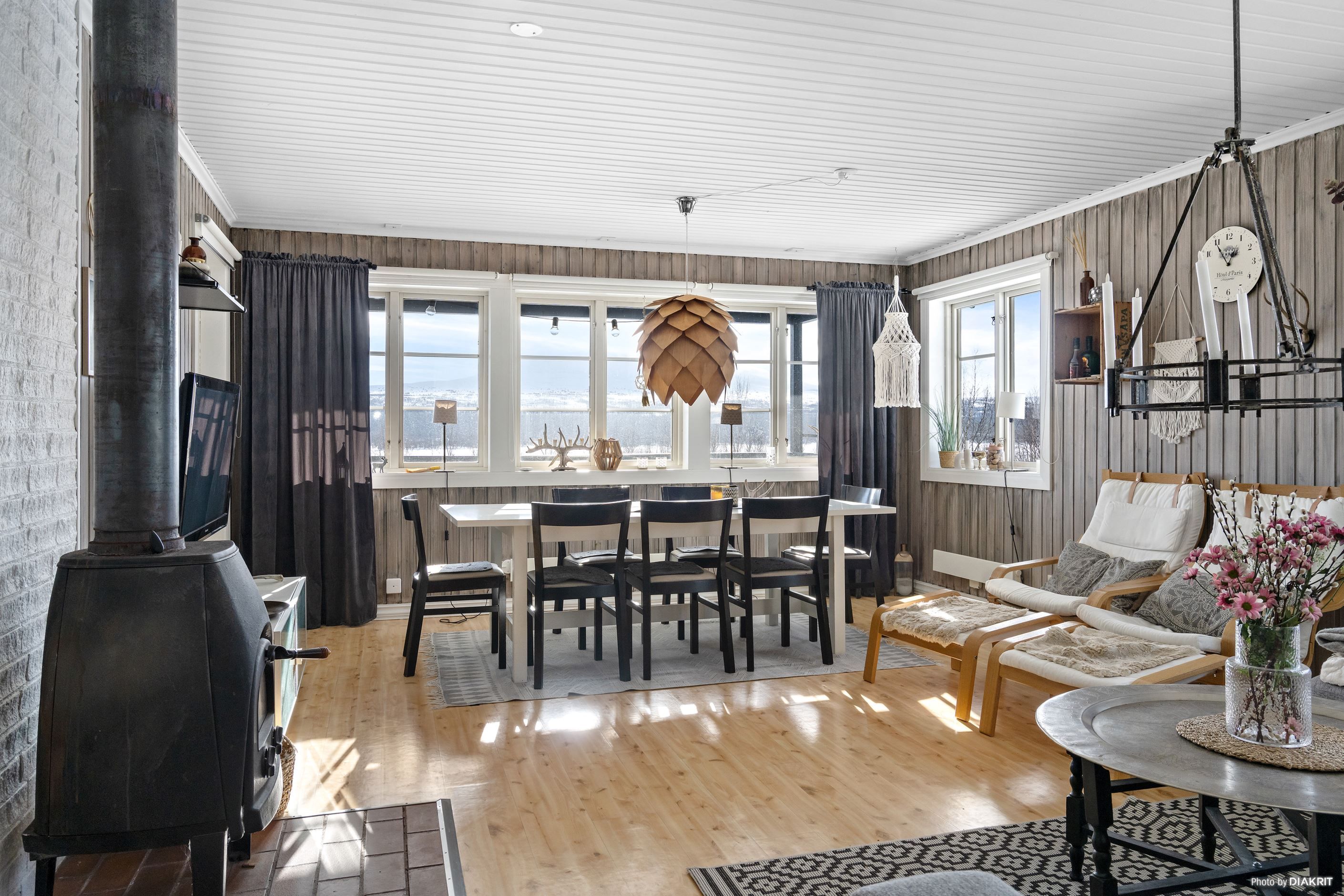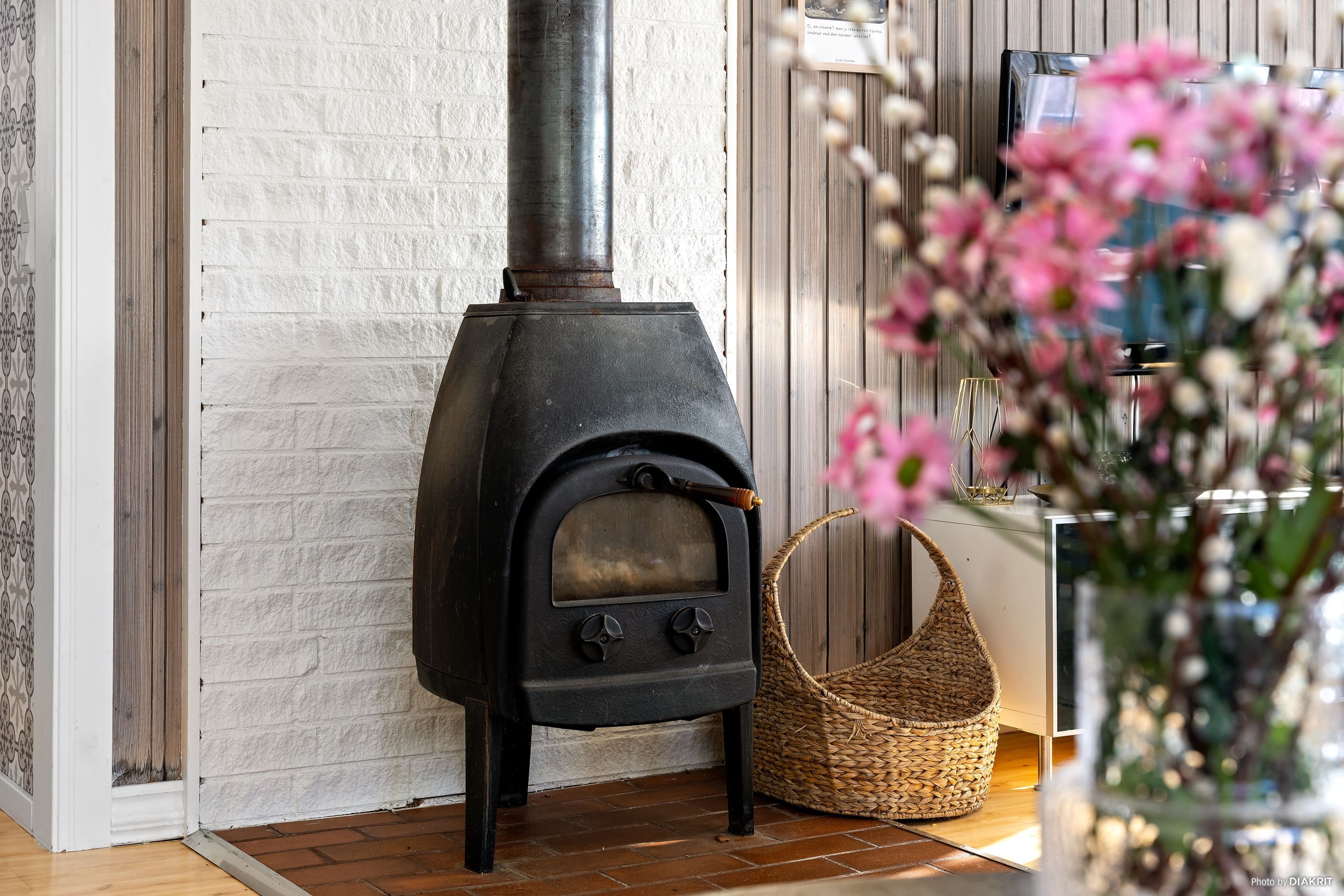 Bostaden präglas av ett ljust och trivsamt allrum där den öppna ytan skapar en naturlig samlingsplats för både familj och vänner. De stora fönsterpartierna ger ett fint ljusinsläpp och bidrar till känslan av rymd, samtidigt som braskaminen ger både värme och stämning.