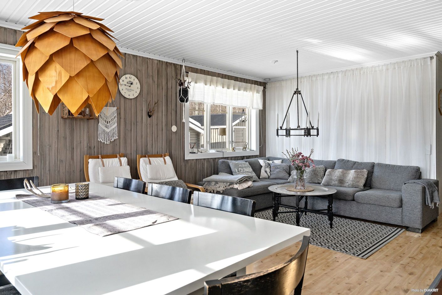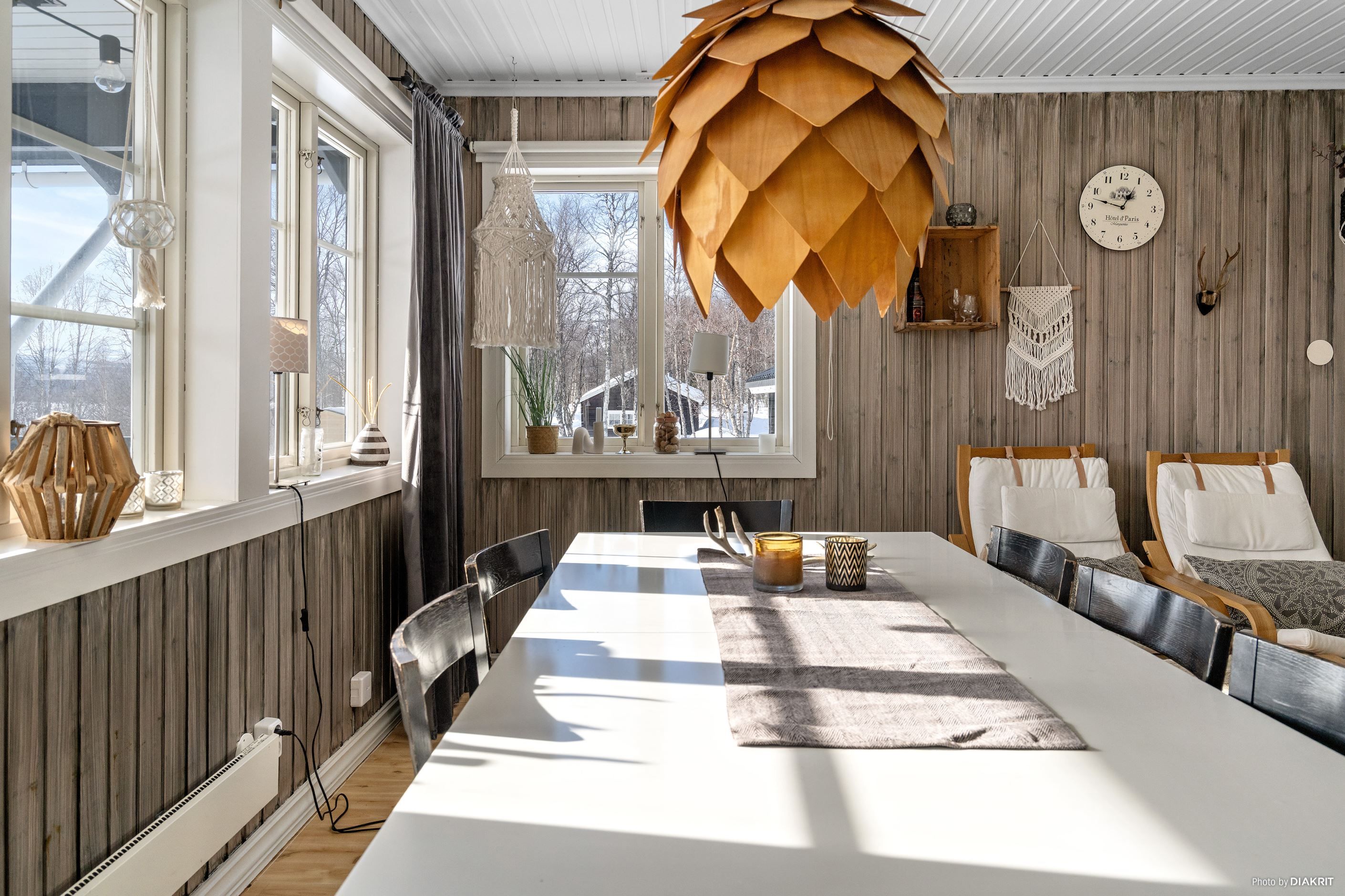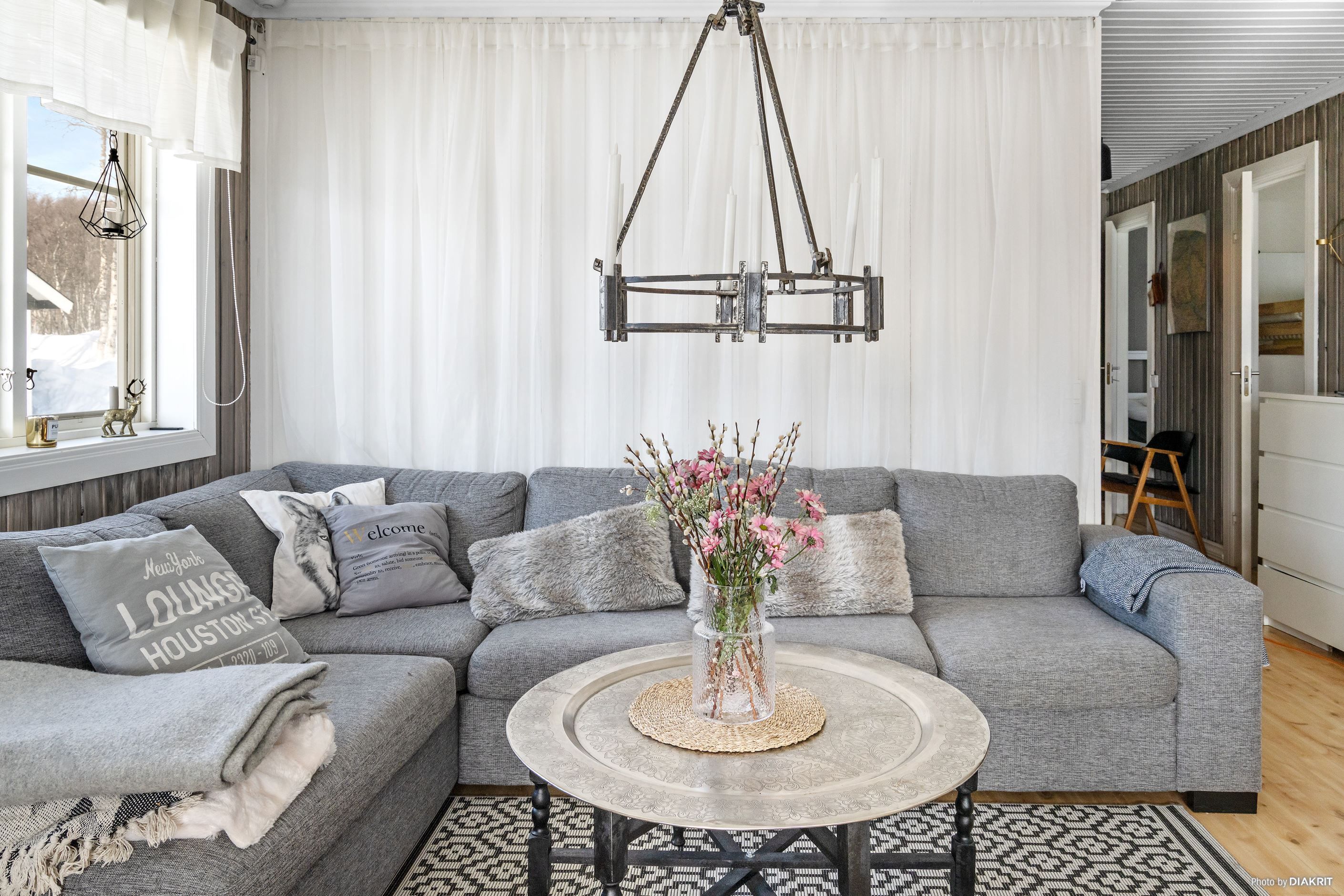 Bostaden präglas av ett ljust och trivsamt allrum där den öppna ytan skapar en naturlig samlingsplats för både familj och vänner. De stora fönsterpartierna ger ett fint ljusinsläpp och bidrar till känslan av rymd, samtidigt som braskaminen ger både värme och stämning.
